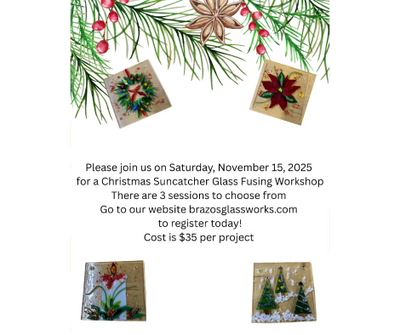Join us on Saturday, November 15, 2025 for Christmas 4x4 Suncatcher Glass Fusing Workshop . 3 sessions to chosse from .